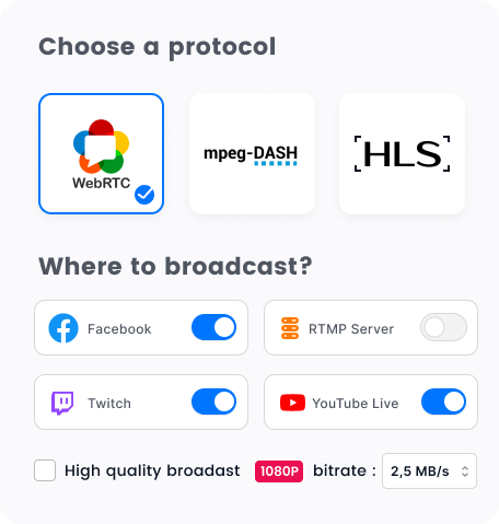- Simultaneous broadcast is possble vie the RTMP protocol, to also broadcast on other internal or external platforms linked to your website, or on social media as Facebook, YouTube, Twitch…