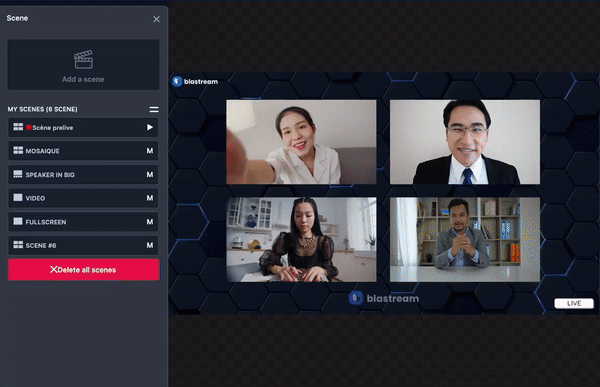 Define in advance each scene of your live session, by defining the type of sources that you want to display on screen (speaker(s), document(s), video(s), picture(s), background, layout…).