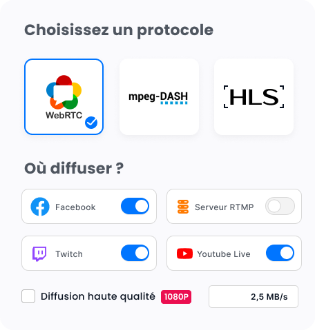 - Choix du protocole : HLS, Dash, Low Latency HLS*, Low Latency Dash (CMAF), WebRTC, FLV*